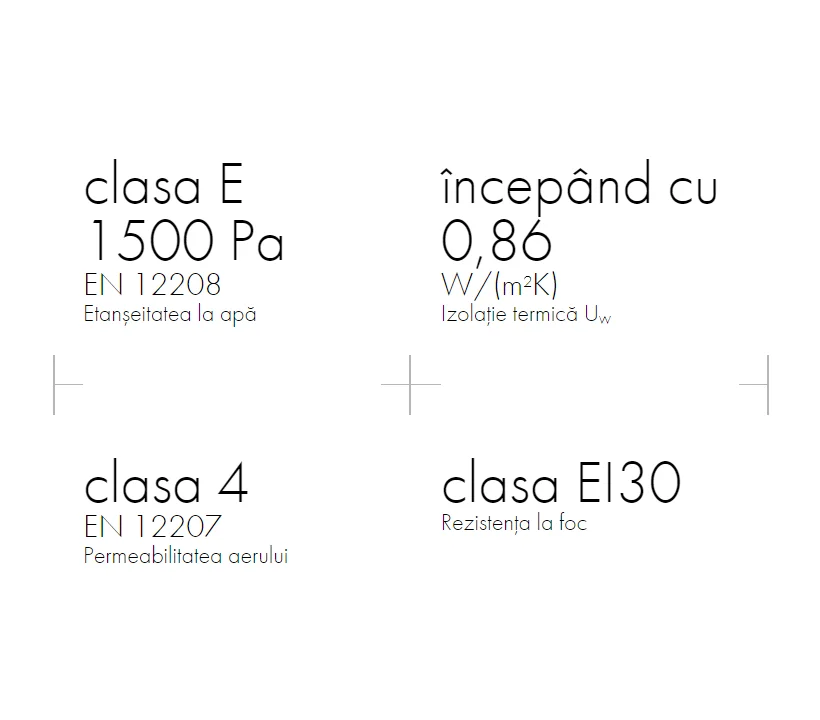 - Rezistența la vânt: ferestre: clasa C5, uși: clasa C1/B1, EN 12210
